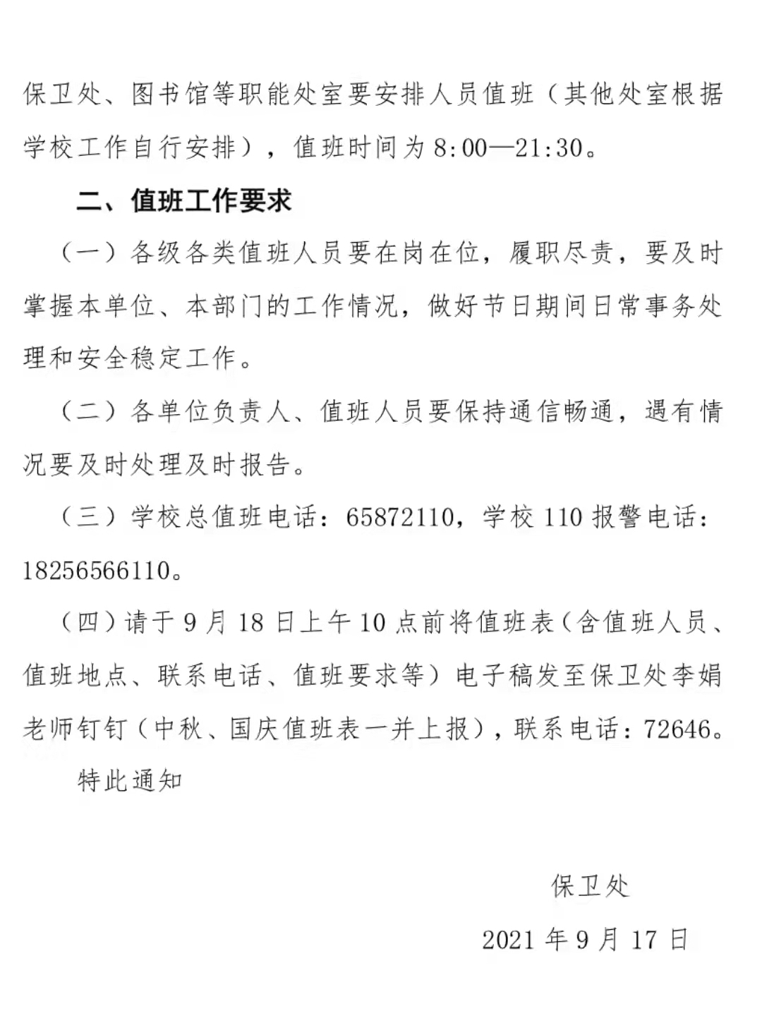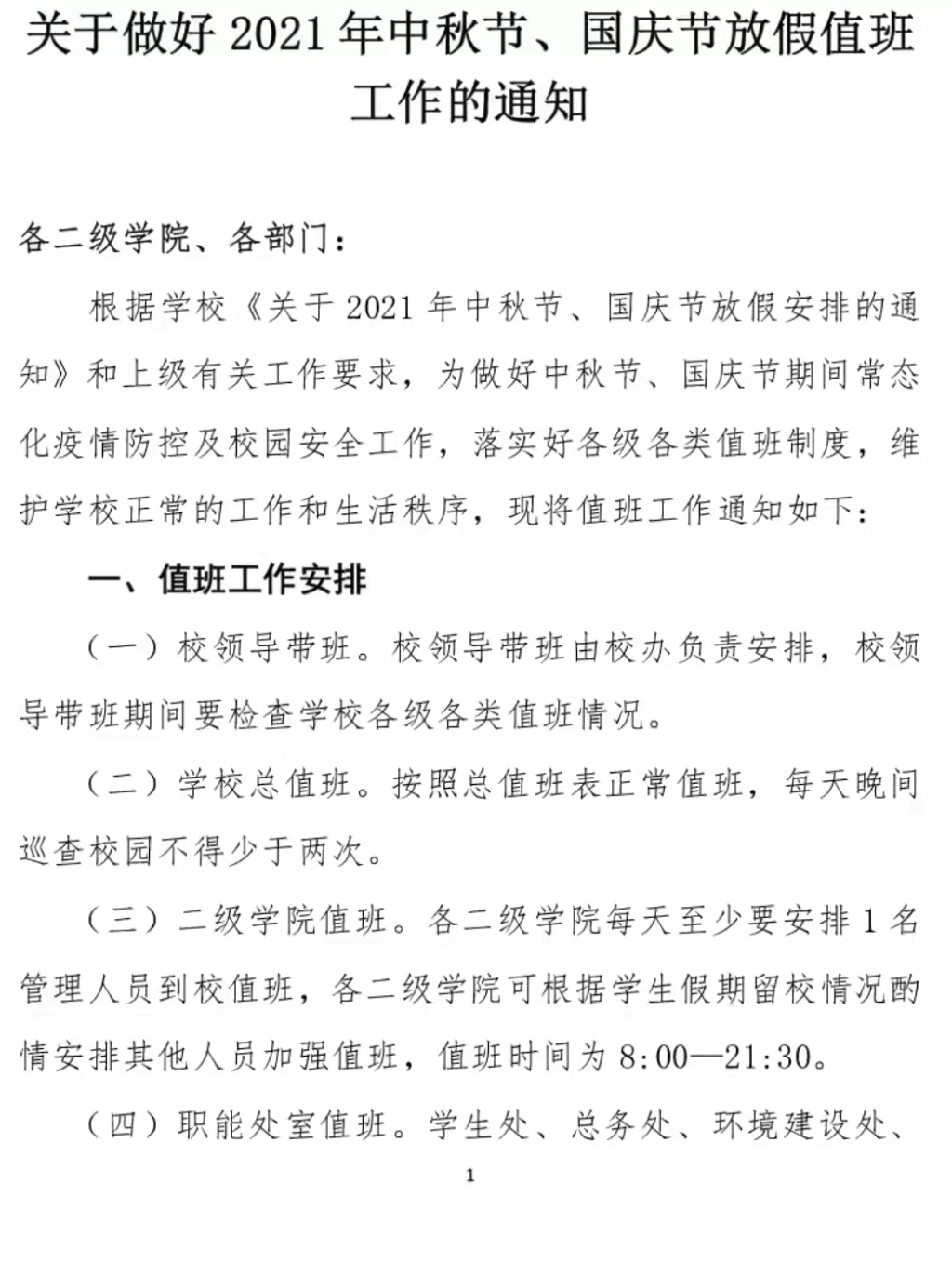 关于早好2021年中秋节、国庆节放假值班工作的通知