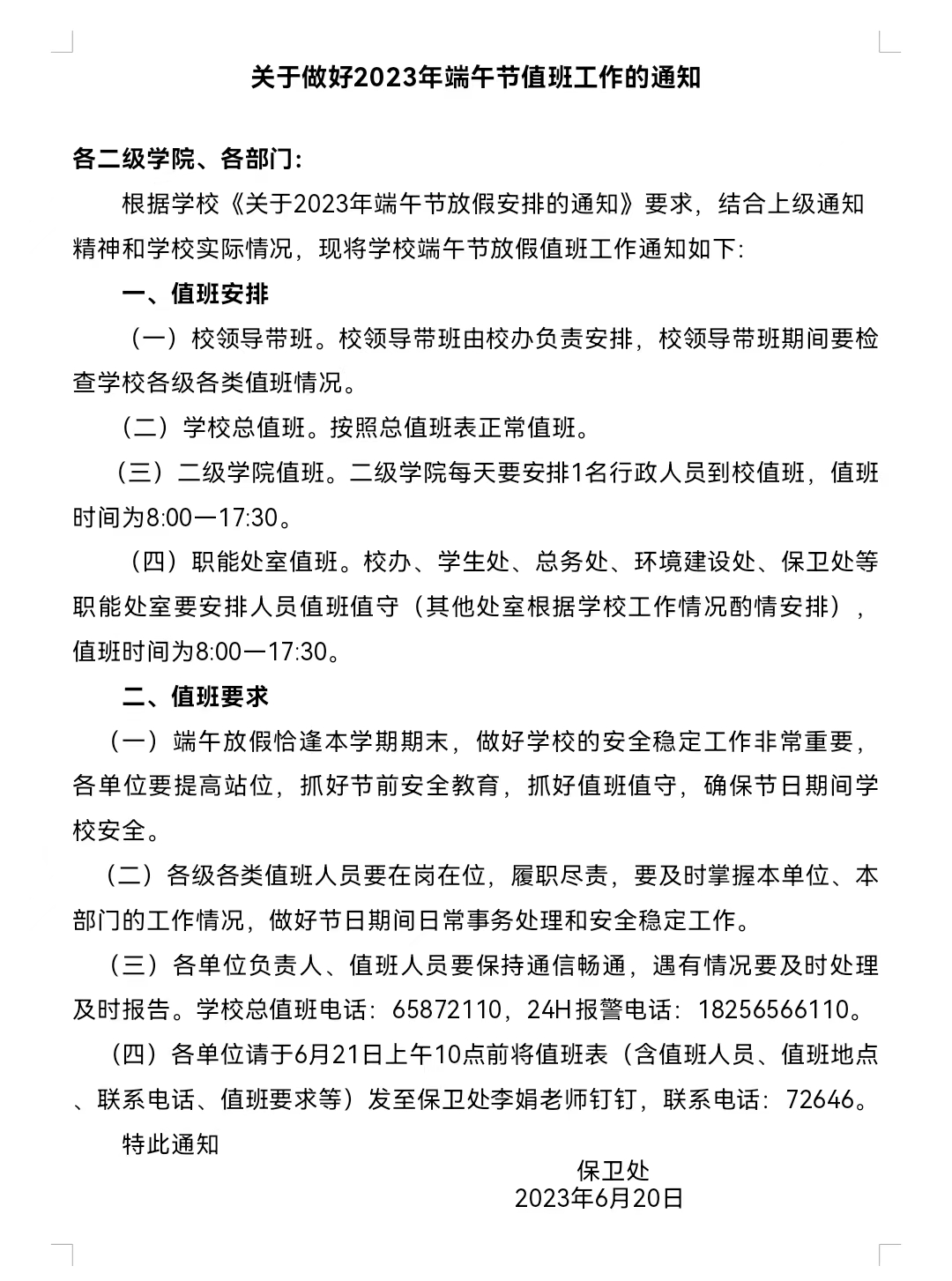 关于做好2023年端午节值班工作的通知