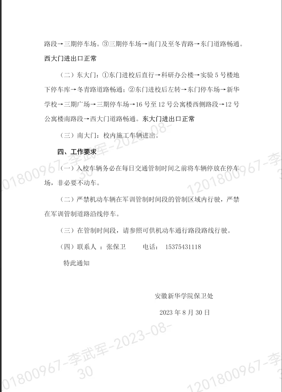 关于新生军训期间校内道路实施临时交通管制的通知