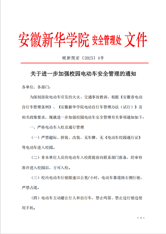 皖新院安〔2025〕4号 关于进一步加强校园电动车安全管理的通知