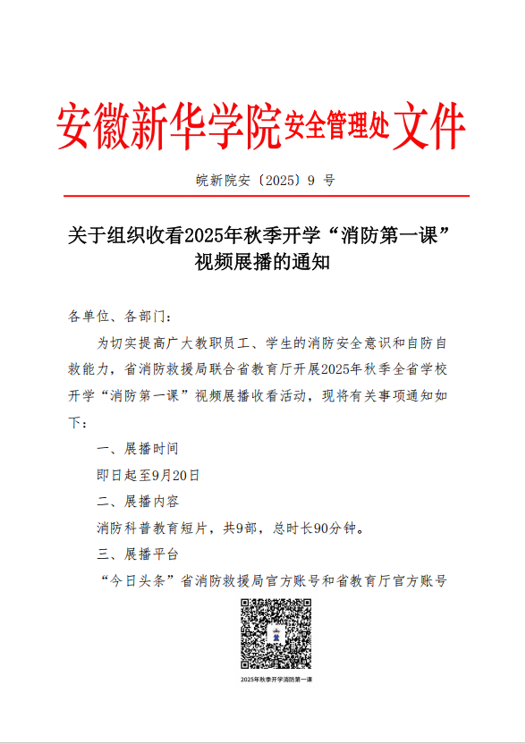 皖新院安〔2025〕9 号关于组织收看2025年秋季开学“消防第一课”视频展播的通知