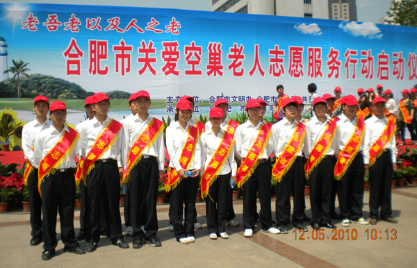 5月12日上午, 合肥市关爱空巢老人志愿服务行动启动仪式在人民广场举行。省文明办主任贺懋燮,市委常委、宣传部长林存安,市人大常委会副主任杜昌寿,市政协副主席盛志刚出席了启动仪式。本次活动由市文明办、市民政局、团市委共同主办,由庐阳区委、区政府承办。我院共有20名志愿者参加了此次活动。