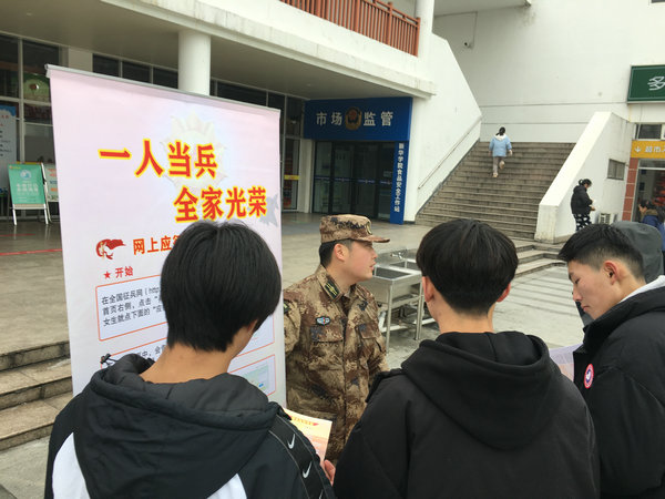 活动中,武装部工作人员向前来咨询的学生介绍报名程序、网上操作办法,并对今年的应征入伍条件、征兵流程、体检和政治条件、优抚政策及退伍后享受待遇等大家普遍关注的话题做了详细解读。现场发放宣传资料200余份。