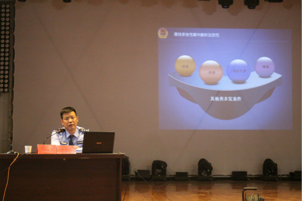 讲座围绕强化安全意识、校园治安安全、消防安全等几个方面展开。谢贺军结合高校校园常发和多发案例,通过列举大量真实的案件,生动形象地讲述了防毒、防盗、防骗、远离传销和仿真枪以及管制刀具等几个方面的安全教育内容。引导同学们深入认知校园安全问题,教育大家抵制邪教组织、增强法制观念、杜绝犯罪行为、防范安全事故。