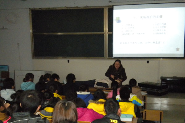 章峥嵘首先简要介绍了国际红十字会和中国红十字会的发展历程,详细讲解了实施救助的安全风险评估、病情判断、自救互救的操作程序与注意事项,认真演示了心肺复苏的操作方法、注意事项和终止条件。同