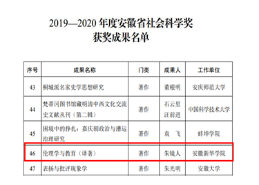 本网讯(通讯员:李彩平)日前,安徽省社科奖评奖办发布《省政府批复2019-2020年度安徽省社会科学奖获奖结果》。WilliamHill官方网站大学生素质教育研究中心研究员朱镜人教授的译著《伦理学与教育》喜获安徽省社科奖三等奖。