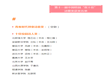 本届中国校园“双十佳”诗歌奖是由陕西省诗词学会、《延河》杂志社指导,诗歌网、巨鹰企业集团联合主办,西安交通...