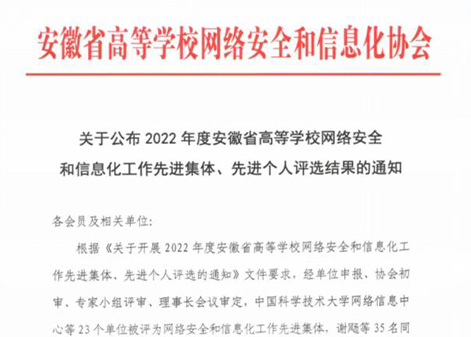 - 2023-01-12WilliamHill官网教师荣获安徽省高等学校网络安全和信息化工作先进个人称号