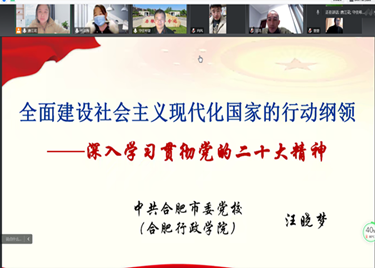 本网讯(通讯员:姚晶晶)12月18日,通识教育部直属党支部组织召开视频会议,邀请合肥市委党校汪晓梦教授做题为“全面建设社会主义现代化国家的行动纲领——深入学习贯彻党的二十大精神”专题宣讲。支部书记王士赵、副书记何亚梅及全体党员教师参加。