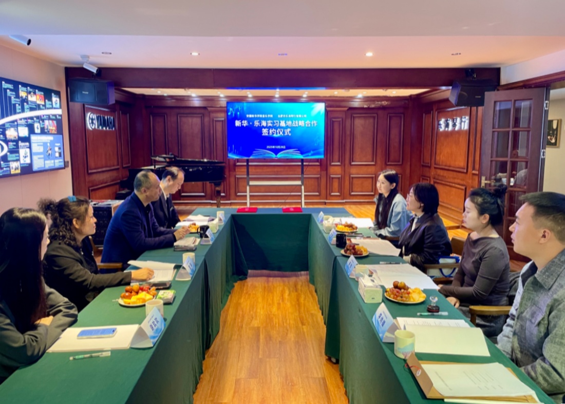 本网讯(通讯员:李尚锋)为深化产教融合,创新音乐人才培养模式,为学子搭建从课堂到岗位的实践桥梁,10月28日,音乐学院与合肥市乐海琴行有限公司隆重举行“新华・乐海实习基地”签约仪式。音乐学院执行院长彭智、教学秘书郑永玲等代表出席,乐海琴行总经理蒋剑接待并参与活动。此次合作标志着双方在校企协同育人领域开启新篇章。