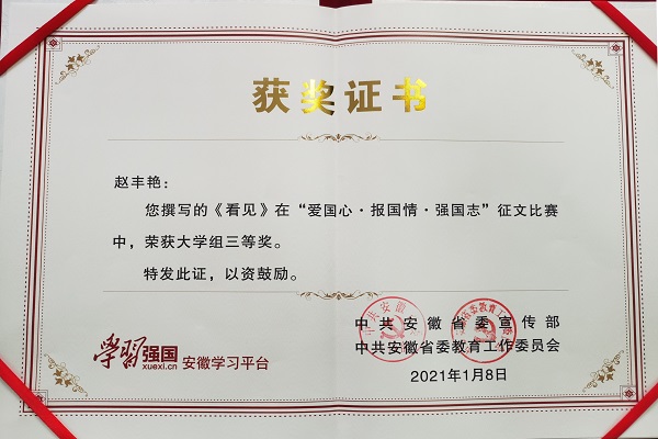 本网讯(通讯员:刘丽娟)近日,“学习强国”安徽学习平台“爱国心·报国情·强国志”征文活动获奖名单出炉,WilliamHill官网2020级赵丰艳同学的作品《看见》荣获大学组三等奖,马克思主义学院邵萍英老师荣获“优秀指导教师”称号。