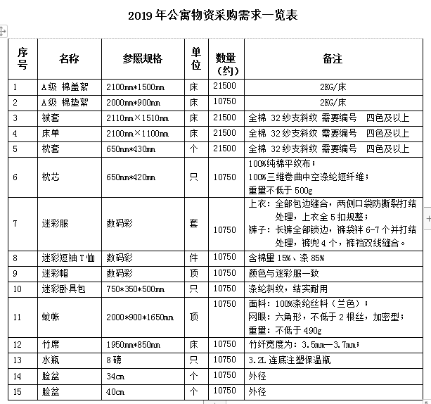 4、报价须知:可分项报价,报价含标的物价、增值税专用发票、包装、运输、自行下货到指定位置,(棉絮、三件套、脸盆、水瓶、竹席除外)
