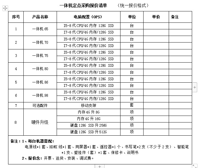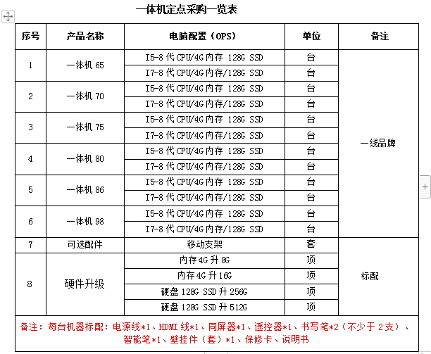 4、招标内容:一体机定点采购一览表