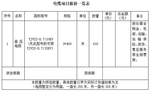 投标方应将电子投标文件、电子投标书、加盖公章扫描,文件名为“电缆采购项目电子报价文件”。将电子投标资料直接发送至:861230741@qq.com邮箱。