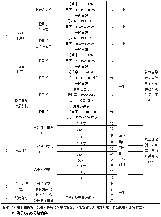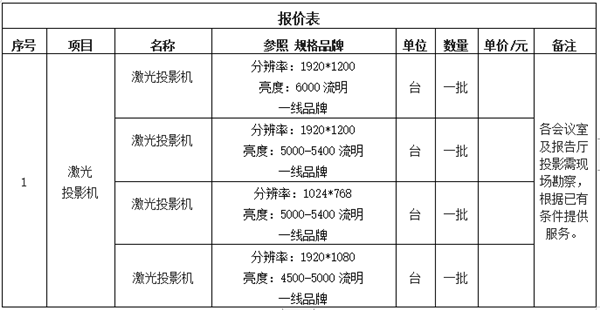 5.提供该批设备品牌、规格型号、报价表(安装环境投标人需自行勘察现场,如投影大小与幕布不符合,装修返工费用由报价人承担);