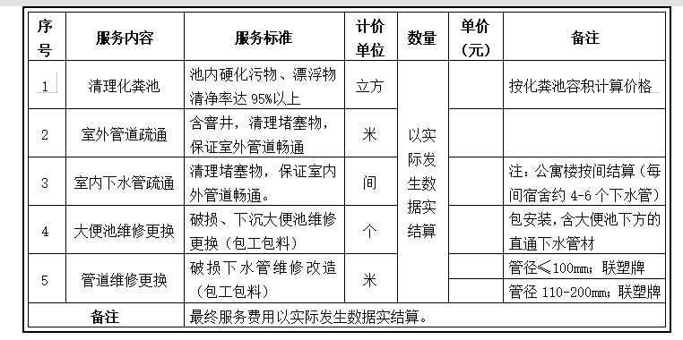 2、化粪池清理,按甲方化粪池实际容积计算价格,乙方对池内硬化污物、漂浮物清净率达95%以上,清理至池底泥沙位置结束,清理完成后池内污水可以自动流淌。