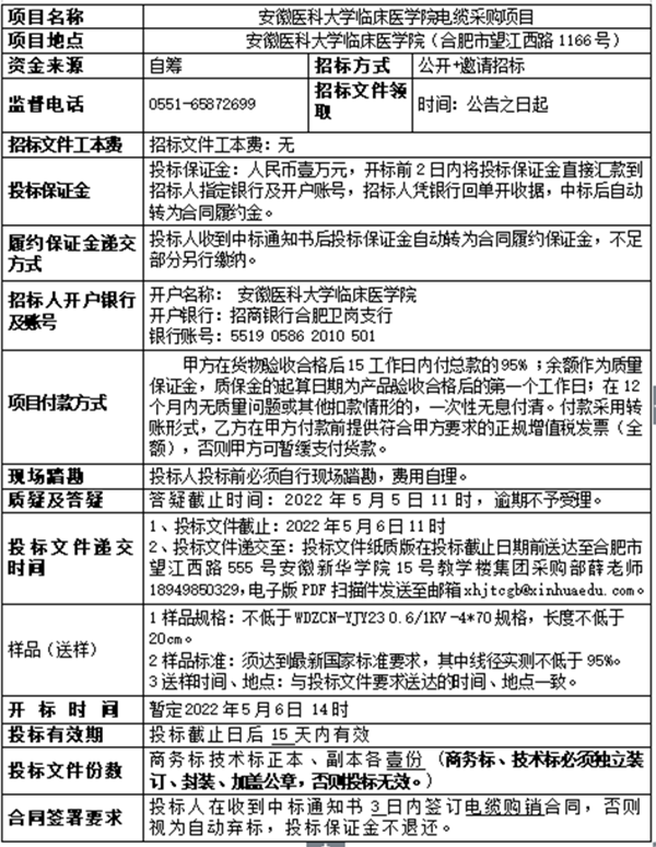 1.项目名称:安徽医科大学临床医学院电缆采购项目