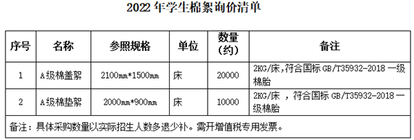 2022年学生公寓物品(棉絮)询价公告