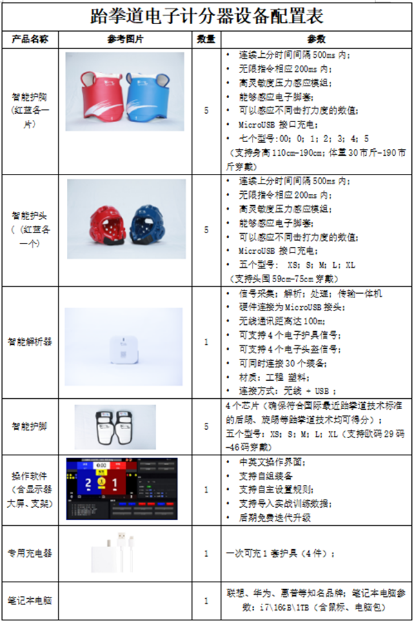 跆拳道电子计分器配置(详见下表)
