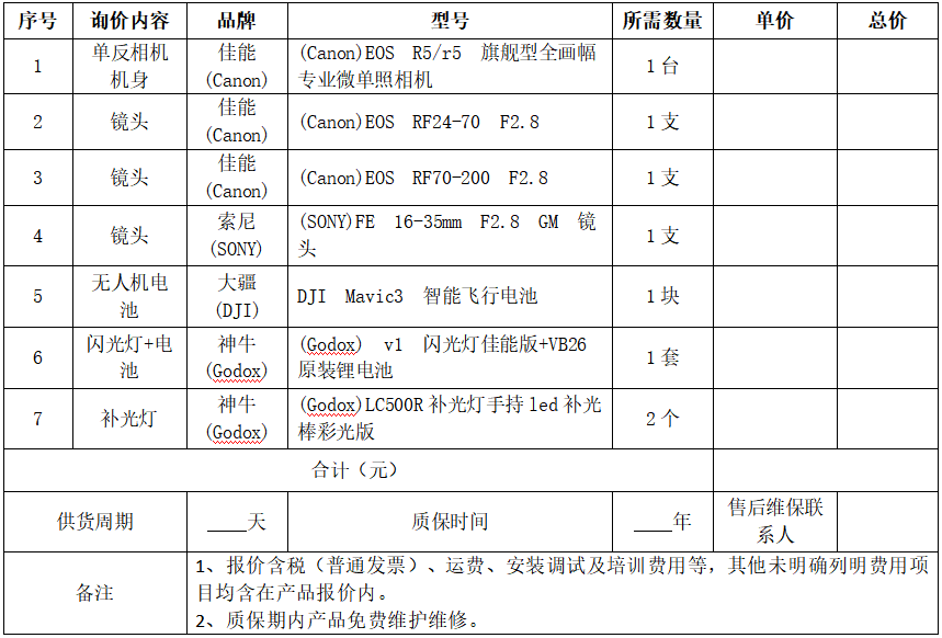 相机、镜头及补光灯等设备报价单