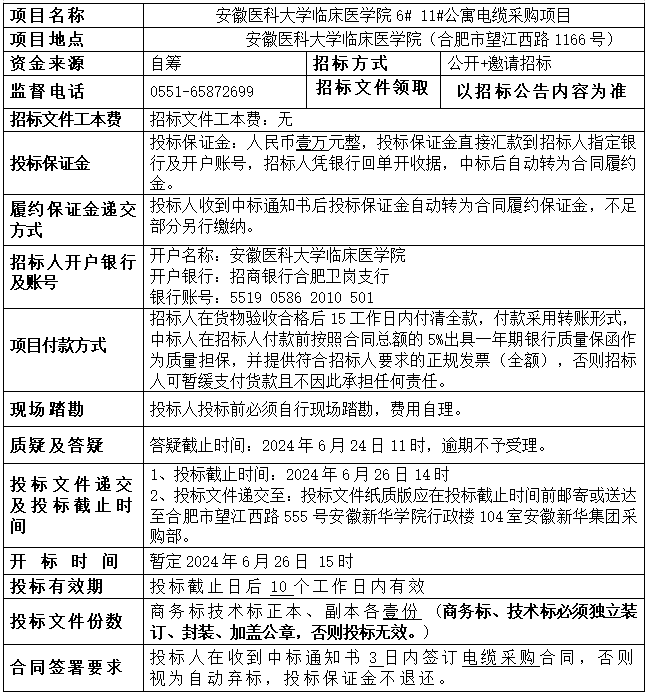 安徽医科大学临床医学院6#11#公寓电缆采购项目招标公告