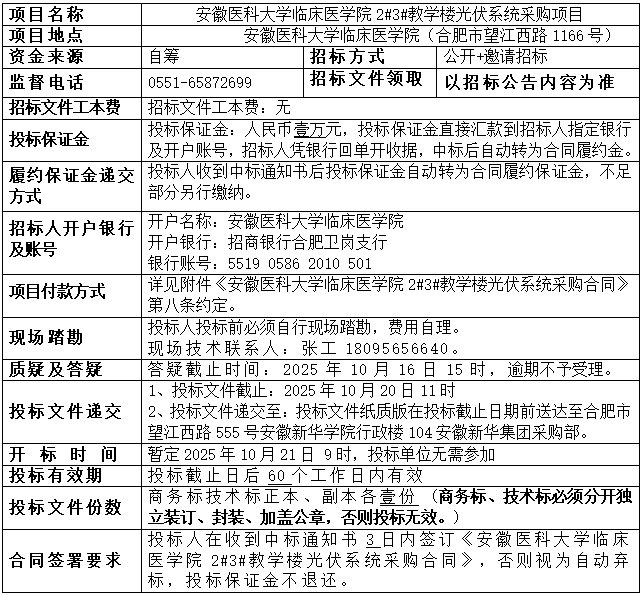 安徽医科大学临床医学院2#3#教学楼光伏系统采购项目招标公告