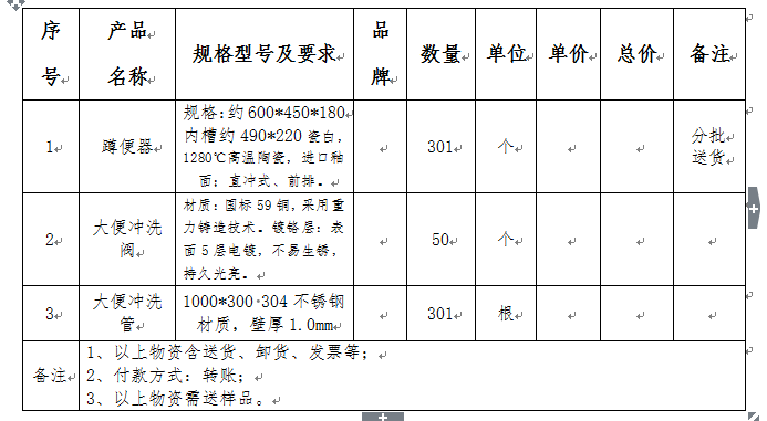 2、询价内容:蹲便器、大便冲洗阀、大便冲洗管(要求品质优越)。