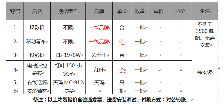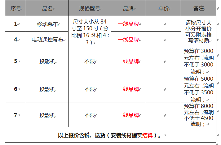 2、询价项目:投影机、幕布