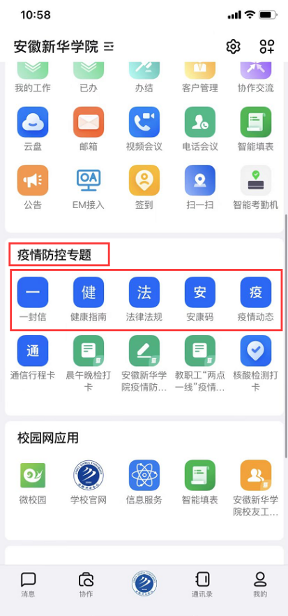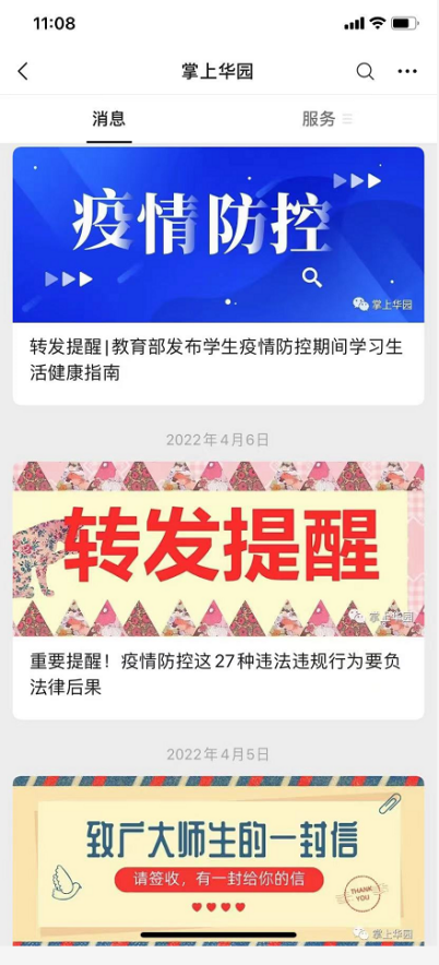 疫情期间,由于疫情形势变化频繁,防疫政策不断变更,为使学生第一时间了解相关政策规定,信息中心通过在钉钉开设疫情防控专题,利用“掌上华园”微信公众号,向学生推送最新的疫情防控政策,帮助学院师生及时了解防控疫情上级精神、学院防控工作动态、疫情防控知识等信息,引导广大师生科学应对疫情,增强师生打赢疫情防控阻击战的信心。