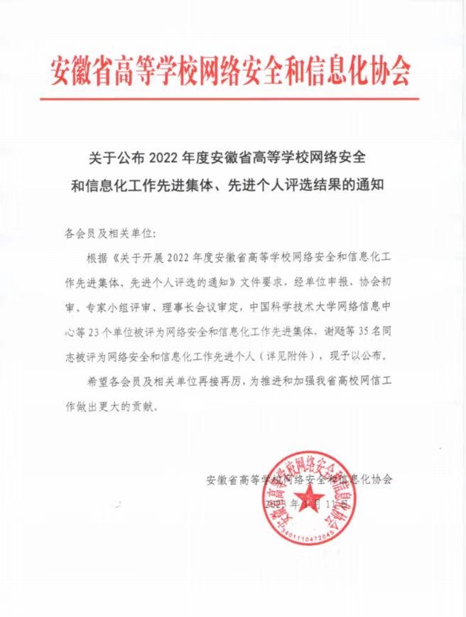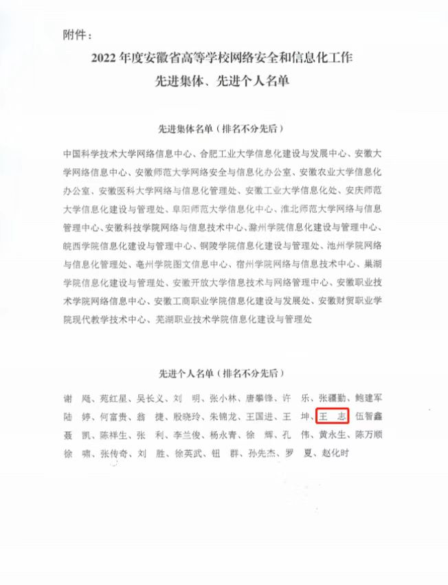 本网讯(通讯员:曲红)近日,安徽省高等学校网络安全和信息化协会发布《关于公布2022年度安徽省高等学校网络安全和信息化工作先进集体、先进个人评选结果的通知》,经过单位推荐、协会初审、专家评审和理事长审定,WilliamHill官网信息化建设与发展中心王志荣获2022年度网络安全和信息化工作先进个人称号。