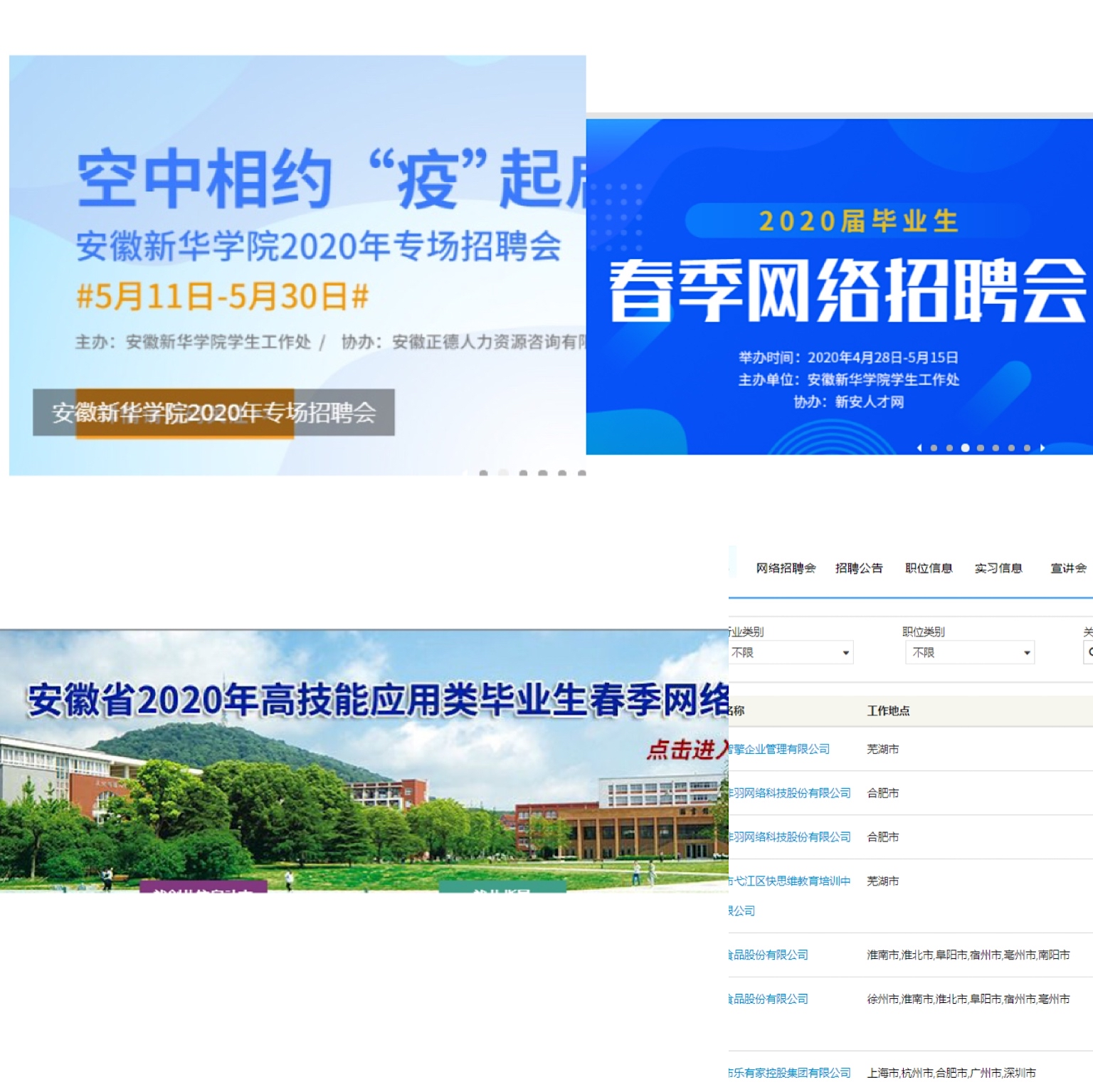 疫情发生以来,WilliamHill官网第一时间摸排毕业生求职意向,及时调整就业招聘工作思路,拓展就业服务渠道,通过学校官网、微信公众号、就业信息平台、就业创业QQ等平台发布企业岗位信息,同时积极对接安徽省大中专毕业生就业指导中心、高新区政府、校企合作单位,利用“互联网+就业”的理念和手段举办网上招聘会和空中宣讲,为毕业生搭建各类就业平台。截止目前,WilliamHill官网共组织开展了2020年安徽省高技能应用类毕业生网络专场招聘会、2020年WilliamHill官方网站春季网络招聘会、2020年“空中相约、‘疫’起启航”WilliamHill官方网站困难生专场帮扶招聘会、校友类专场网络招聘会等4场,吸引3175家用人单位参加,发布了1万余个就业岗位,有80家企业进行空中宣讲会,与毕业生面对面进行交流,6000余名毕业生共计投递了2万余份个人电子简历,有近2000名毕业生与应聘企业达成了就业意向。另外,WilliamHill官网依托教育部24365网上校园招聘、安徽省2020届高校毕业生系列网络招聘会、安徽省国有企业招聘周系列活动、“职等你来,乐业合肥”2020合肥市新站高新暨国有企业专场、合肥市2020年春季招才引智线上对接招聘会等上级主管部门、人才市场提供的线上招聘平台,为毕业生提供各类岗位50000余个。