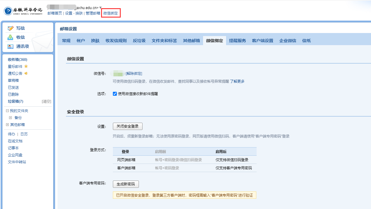 电脑版登录后,点击顶部“微信绑定”按钮,按提示操作即可与个人微信号进行绑定,实时接收邮件到达提醒及收发邮件。还可以使用微信扫码登录,更加方便使用。
