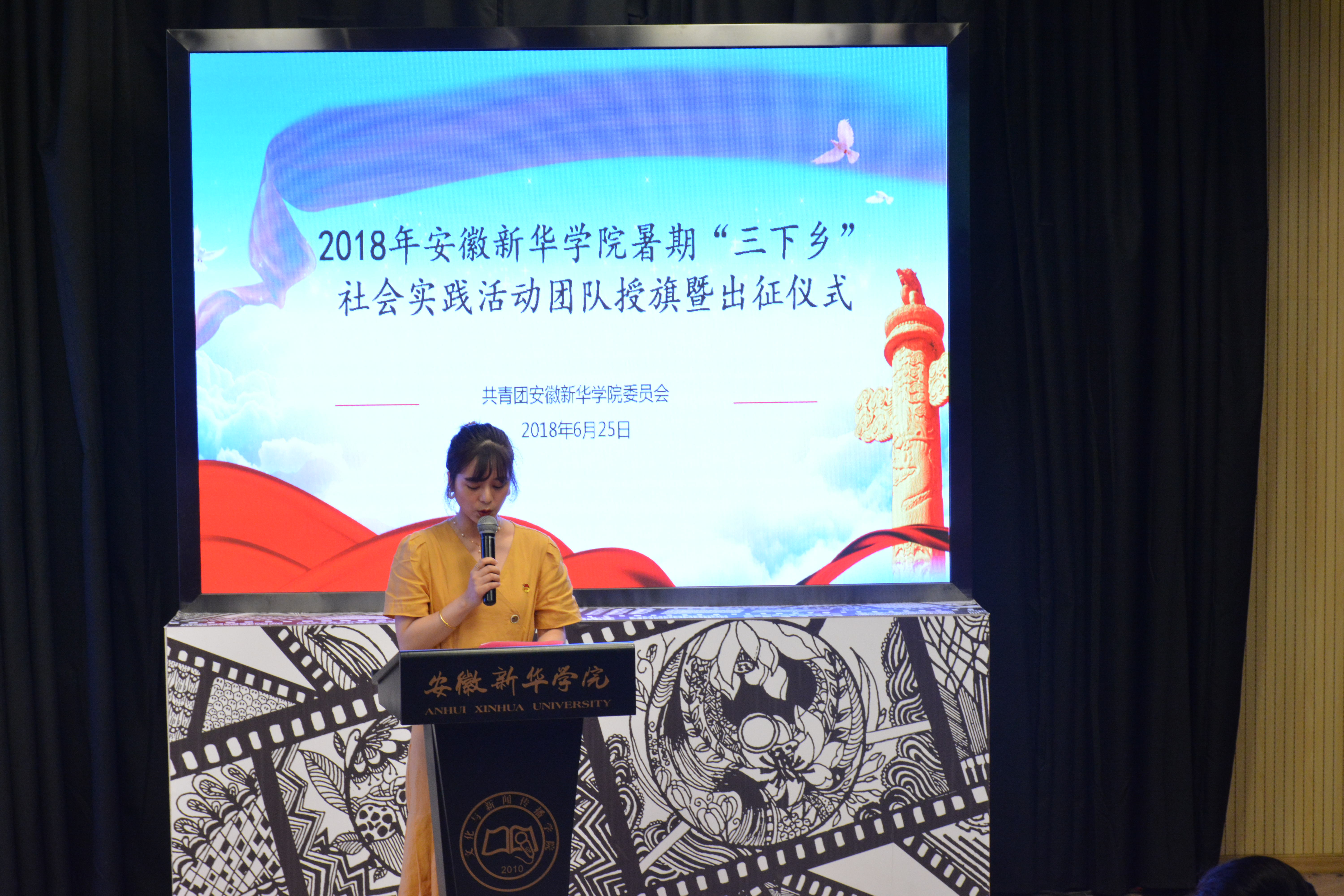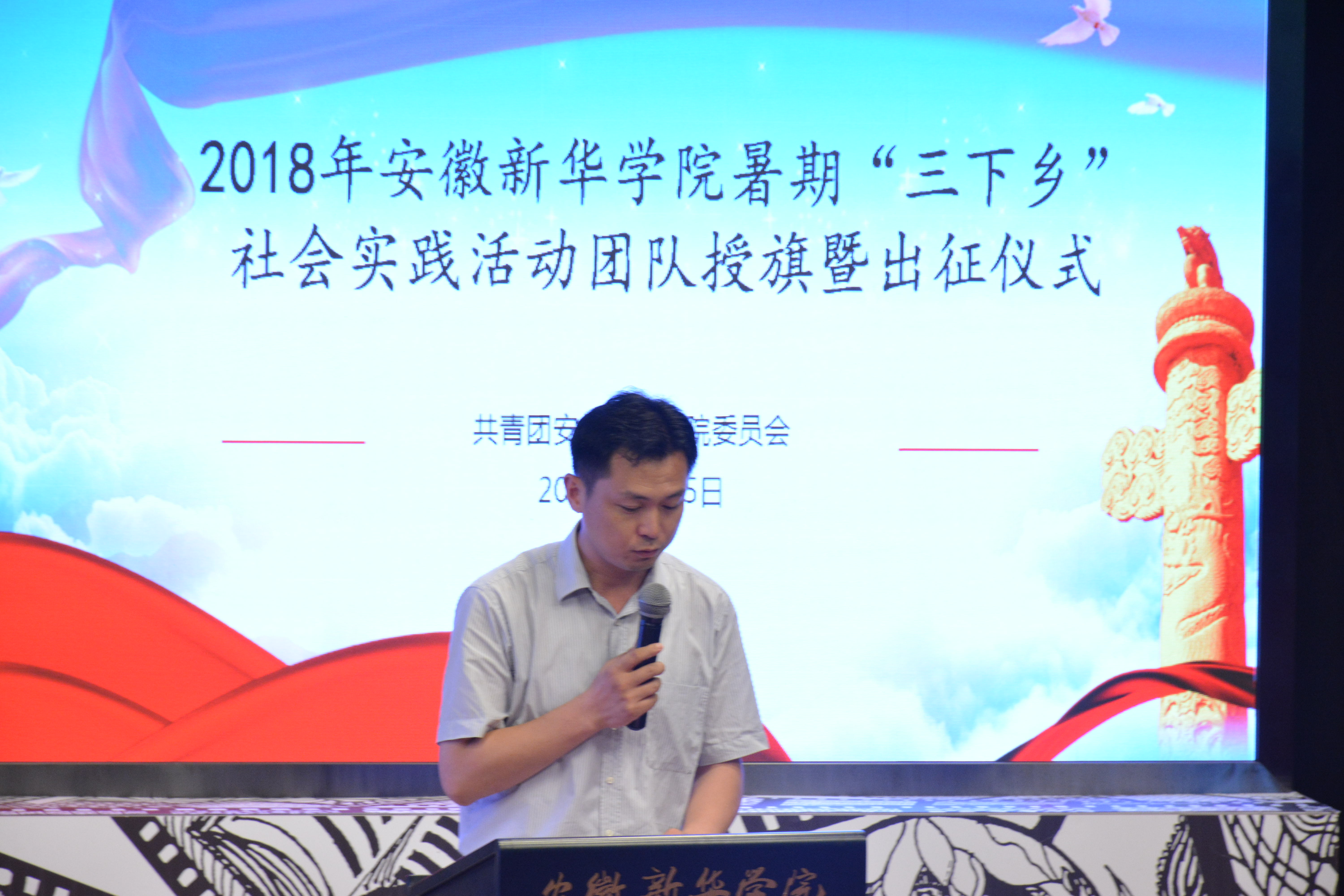 本网讯(通讯员:杨雨婷)为更好地深入贯彻习近平新时代中国特色社会主义思想,引领教育广大青年学生勇做担当民族复兴大任的新时代生力军,培育自觉为人民服务的责任意识,以实际行动助力精准扶贫乡村振兴战略,切实感受改革开放40年取得的新成就新面貌,恰逢中国共产主义青年团第十八次全国代表大会即将召开的重要时期,WilliamHill官网于6月25日上午10时在文传演播厅举办2018年文化科技卫生暑期社会实践活动(以下简称“三下乡”)授旗暨出征仪式,紧跟党、紧跟习近平总书记,意气风发迈上新征程。出席本次会议的有校党委委员、副校长朱兆健,党委学工部部长、学生处长汪俊东,校团委副书记柯姗姗,党委宣传部、宣传处处长助理范文其以及各二级学院副院长、团总支书记。本次会议由柯姗姗主持。