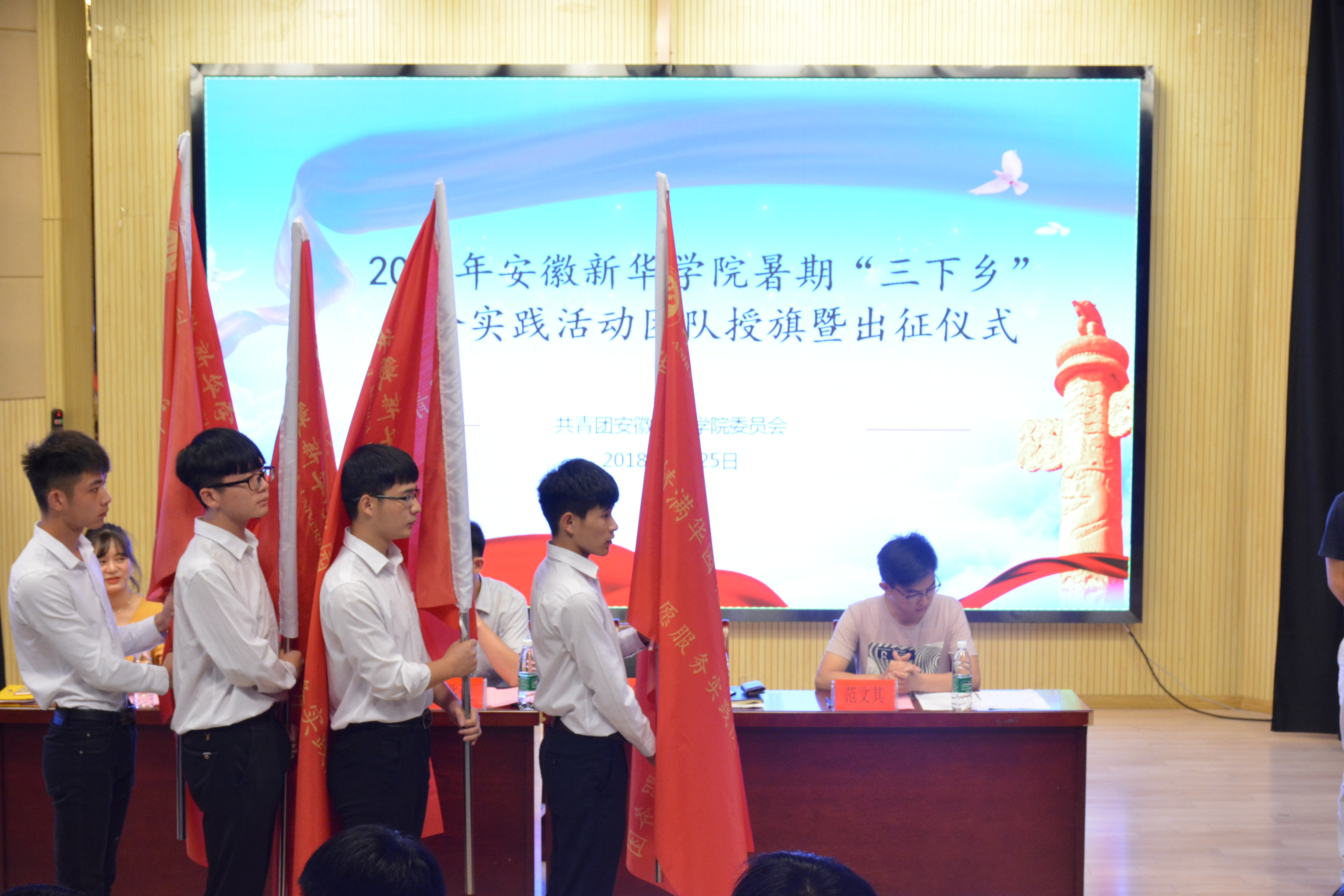 会议在昂扬的团歌中拉开帷幕首先,校团委杨雨婷老师宣读《关于开展WilliamHill官网2018年大学生暑期“三下乡”社会实践活动通知》,明确本次活动以“青春大学习 奋斗新时代”为主题,阐述工作原则和实践方式,并提出相关事宜和要求。她提出,希望各团队充分发挥三下乡社会实践活动的育人作用,扩大工作覆盖和教育时效。组织引领大中专学生在社会实践中增强“四个意识”,坚定“四个自信”。随后,宣传处处长助理范文其就2018年大学生暑期“三下乡”社会实践活动宣传工作要求。他要求,各团队要积极主动与校内外新闻媒体联系,努力加大社会实践活动宣传的深度和广度,形成立体化的宣传形式。在大学生暑期“三下乡”社会实践活动取得成效的基础上,加大社会宣传力度,创造良好的社会舆论氛围,树立起大学生的良好形象,促使社会更好地认识大学生社会实践的意义,也使更多的学生从中受到教育。大会第四项,由学生处长汪俊东和副校长朱兆健为重点实践团队授旗。为更好地鼓励团队、加大帮扶力度,进一步推进WilliamHill官网暑期社会实践活动持续深入开展,发挥社会实践作为加强大学生思想政治教育重要途径的优势,经各单位前期选送及校团委审核,WilliamHill官网确定了校级全额资助重点实践团队和院级重点实践团队。各团队接过队旗,手握出征旗,豪情满胸襟,斗志昂扬奔赴目的地。接下来,“三下乡”暑期社会实践队队员和指导老师代表分别作出征前讲话,对自己即将投身暑期社会实践活动表示欣喜和激动,同时承诺将全力以赴,将这次“三下乡”社会实践活动作为施展才华的舞台,力争圆满的完成预定的各项实践任务,在农村基层展现风采,奉献智慧,贡献力量。