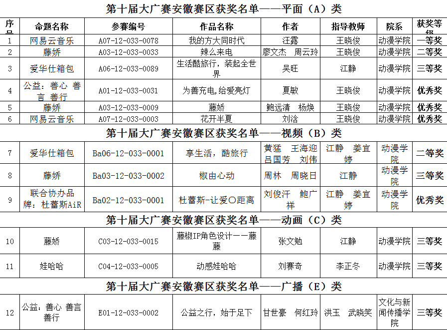 据悉,本次大广赛安徽赛区评选是由安徽省教育厅主办、合肥工业大学承办,共收到来自安徽省内78所高校(含二级院校148所)报送共计9023件作品为有效参评作品。评审委员会通过分组初审、复审、集体合议终审等评选环节,最终从9023件参赛作品中评出一等奖作品126件、二等奖作品249件、三等奖作品382件、优秀奖作品764件。