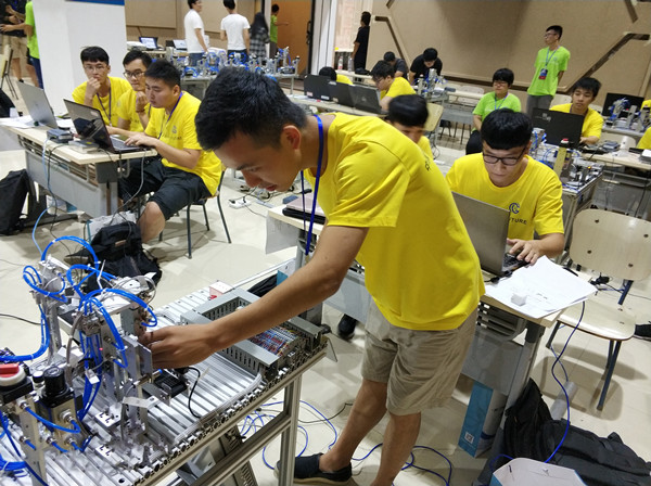 8月25日至29日,2018年“西门子杯”中国智能制造挑战赛全国总决赛在北京化工大学举行。比赛采用全新的方式,在每个比赛日,现场公布当天的比赛题目(含具体控制任务及要求),参赛队伍需要在规定时间内,针对选定的具体任务,独立进行现场项目设计与实施,同时参赛队伍需要按照评审专家要求配合完成必要的工作流程运行演示,评审专家依据任务实施的情况对参赛队伍进行评判打分,竞赛强度、难度之大均远超往年。其中逻辑控制设计开发赛项以智能工厂综合平台为被控对象,系统完成一个触点开关的组装过程,需要现场完成PLC程序的编写、WINCC界面的设计、IOT2040网关的使用、现场数据的订阅及工程文档的撰写。面对完全陌生的被控对象,顶着很大的压力,参赛师生凭借扎实的知识、过硬的实操功底、良好的心理素质和永不放弃的精神,经过3天3场的比拼,获得了国家一等奖,这也是电子通信工程学院在此项比赛中取得的又一项突破!