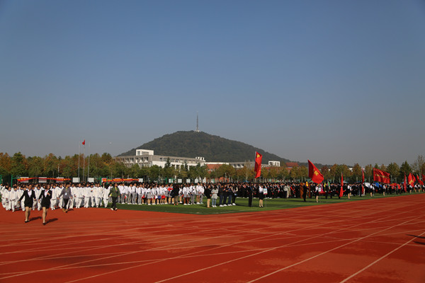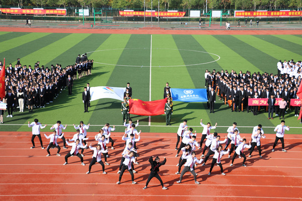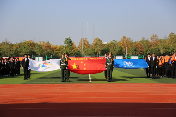 伴随着欢快昂扬的运动员进行曲,护旗手高举国旗、校旗和本届运动会会旗,精神抖擞地走过主席台。各二级学院代表团紧随其后,迈着强健有力的步伐,依次入场。