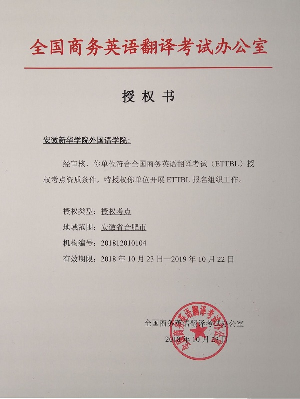 安徽省首家全国商务英语翻译考试授权考点落户WilliamHill官网外国语学院