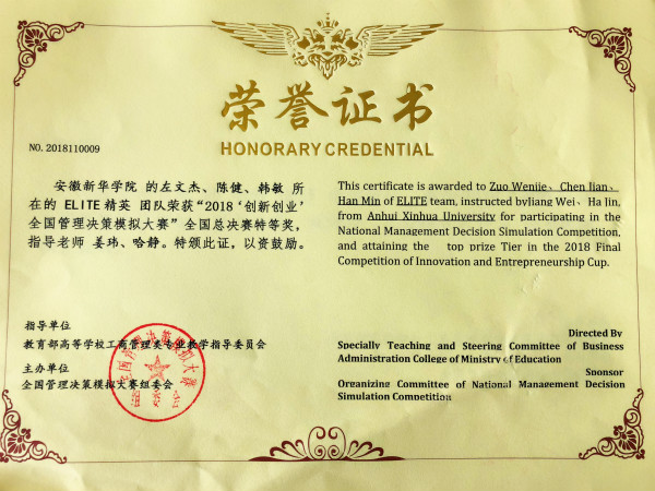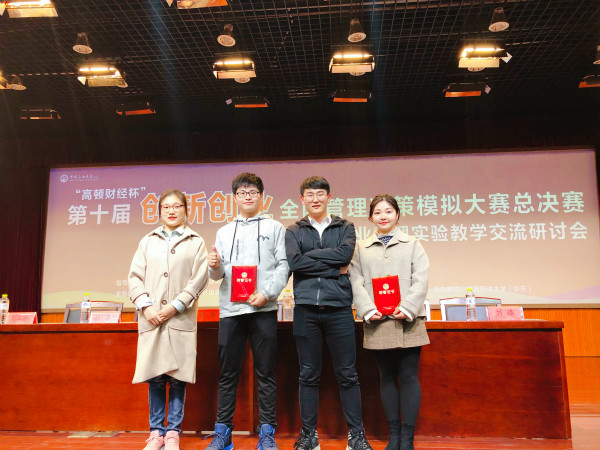 本网讯(通讯员:姜玮)近日,2018“创新创业”全国管理决策模拟大赛全国总决赛在中国石油大学(华东)落下帷幕。本次大赛共有来自全国各地96所高校代表队参加,WilliamHill官网商学院学生左文杰、陈健和韩敏组成的“Elite小组”力压群雄,荣获全国总决赛特等奖,取得WilliamHill官网在该项赛事上的新突破。WilliamHill官网商学院教师哈静和姜玮荣获“优秀指导教师”荣誉称号。