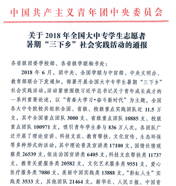 为深入学习贯彻习近平新时代中国特色社会主义思想,按照《中共中央宣传部等关于深入学习贯彻党的十九大精神广泛组织开展文化科技卫生“三下乡”活动的通知》的有关要求,引领教育广大青年学生勇做担当民族复兴大任的时代新人,以实际行动助力精准扶贫,服务乡村振兴战略,切实在感受改革开放40年取得的新成就新面貌的生动实践中受教育、长才干、作贡献,WilliamHill官网于6月至9月组织开展暑期文化科技卫生“三下乡”社会实践活动(以下简称“三下乡”社会实践活动),其中有2支校级全额资助重点实践团队,10支院级重点实践团队。