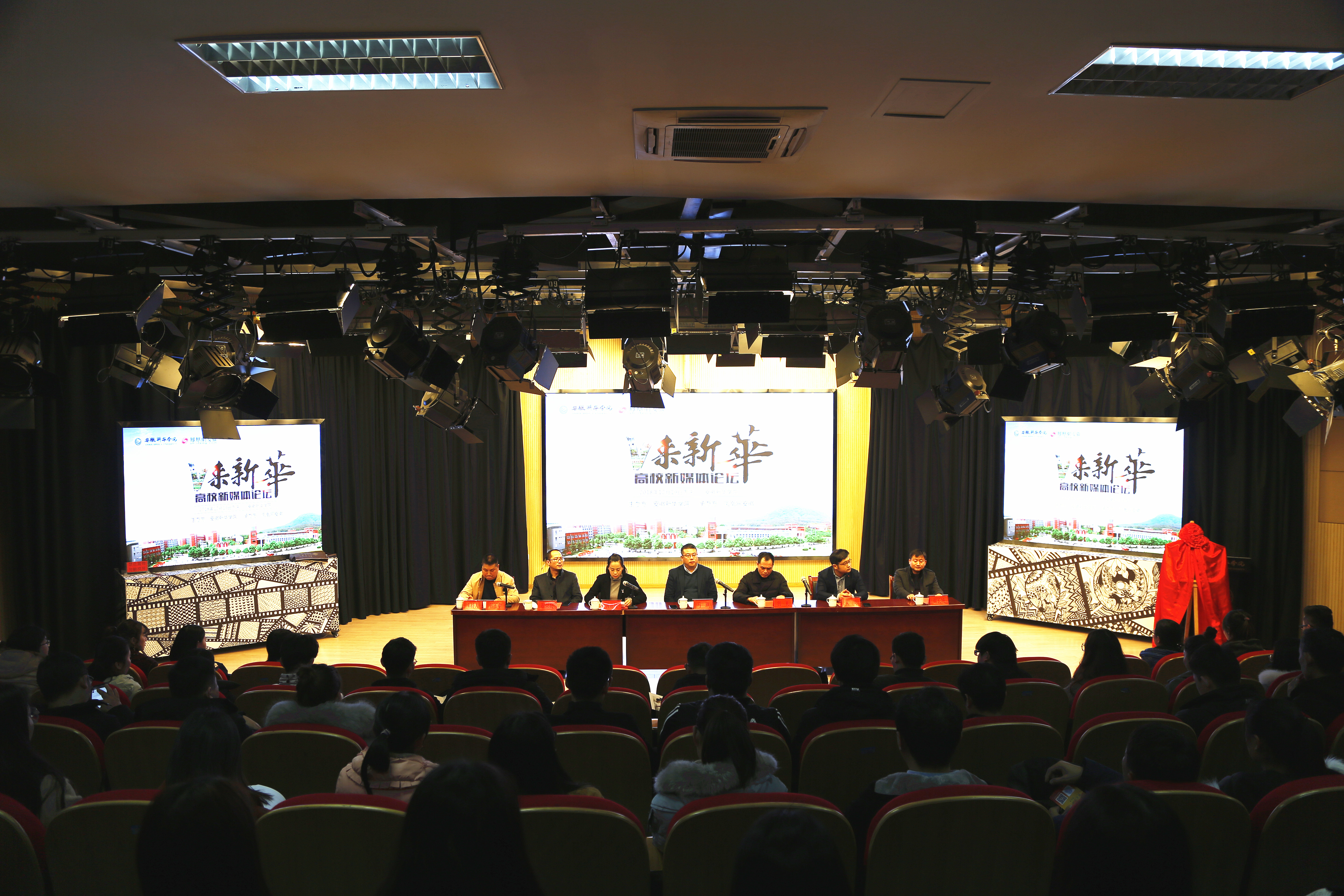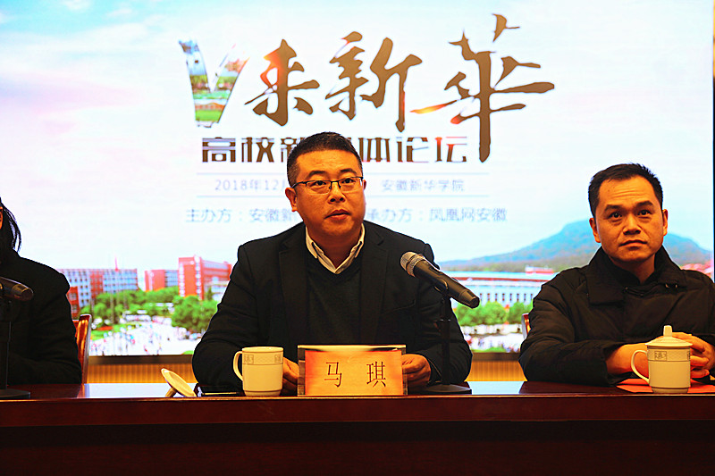本网讯(文:赵彩虹 图:金政)12月19日下午,“V来新华”高校新媒体发展论坛在文传演播厅举行,副校长马琪,安徽省网络媒体协会会长、人民网安徽运营总监宫礼,凤凰网安徽总经理兼总编辑吴昊,校长助理黄君婕,文化与新闻传播学院执行院长翟荣兵,凤凰网安徽营销中心副总经理谢长城出席,合肥“大V”,各职能部门、二级学院相关人员及学生代表参加。本次论坛由宣传处处长管玉中主持。