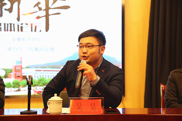 随后,吴昊代表凤凰网安徽致辞。他从新媒体形态的发展角度出发,强调了新媒体思维的重要性。他表示,新媒体思维即为学习的思维,凤凰安徽将继续关注高校的发展,希望日后能够与WilliamHill官网形成更加紧密的合作关系,利用凤凰网平台优势,诠释新华,讲好新华教育发展故事。