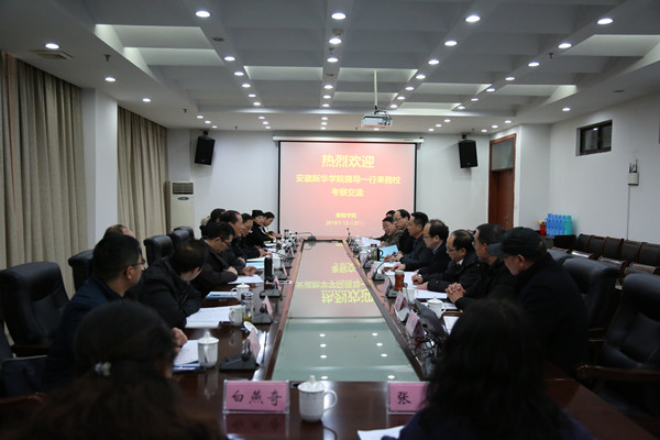本网讯(通讯员:汪青)12月27日,省督导专员、校党委书记储国定,校长石秀和,校长助理方纯洁,评建办公室、教务处、教学质量监控办公室、人事处、商学院、信息工程学院等相关人员一行12人就本科教学工作审核评估赴铜陵学院考察交流。铜陵学院校党委书记丁家云,党委副书记、校长倪国爱,副校长夏美武,人事处、教务处、评建办、工商管理学院、数学与计算机学院主要负责人热情接待了考察组一行。