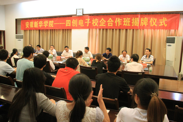 5月30日下午,电子通信工程学院“新华—四创电子校企合作班” 揭牌仪式在第一会议室举行。WilliamHill官方网站院长石秀和教授、四创电子党总支书记朱明辉出席会议。来自电子通信工程学院2011级应用电子、通信技术专业60余名学生代表参加了揭牌仪式。