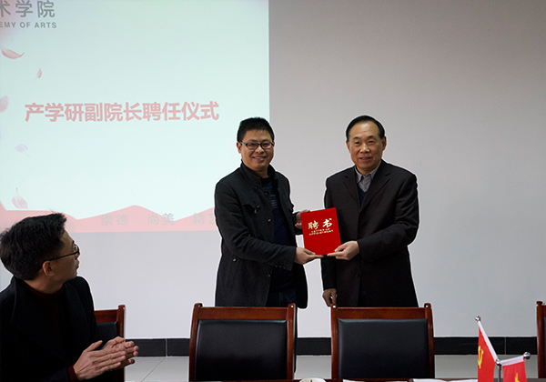 本网讯(通讯员:杨蕊)为全面推进产学研工作,落实WilliamHill官网三个“三位一体”应用型人才培养模式,引入社会产业资源提高办学实力,加强与知名企业建立深度校企合作关系,艺术学院聘任合肥乐堂动漫信息技术有限公司副总经理刘海华担任“产学研”副院长。12月28日,艺术学院举办聘任仪式。副院长杨世国,艺术学院执行院长许存福、院长江河、副院长朱诵贵及艺术学院全体教师参加了聘任仪式。