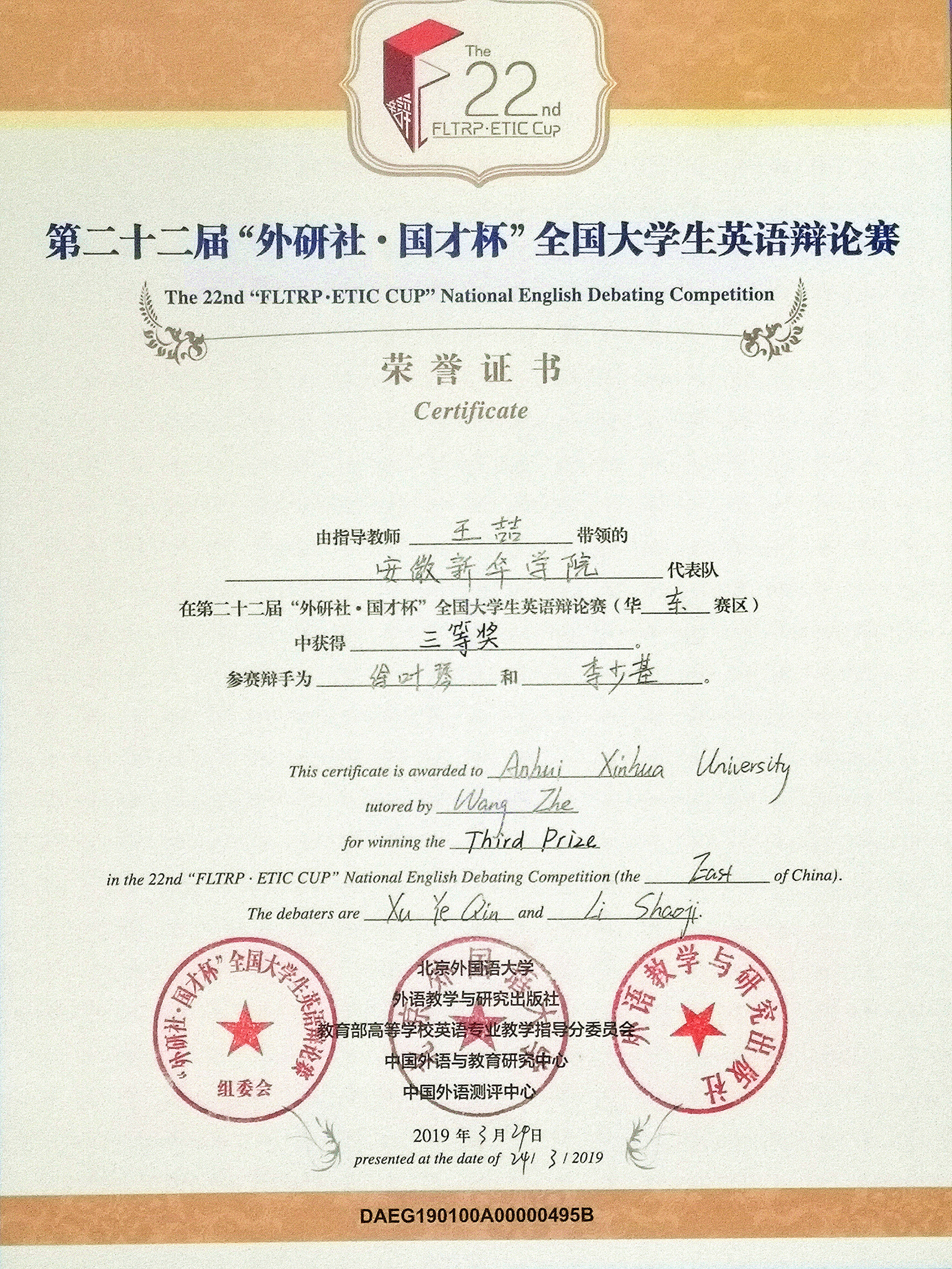 据悉,本次大赛由苏州西交利物浦大学和外研社主办,比赛的112多支高校代表队选拔自华东地区的等一百多支高校队伍,其中包括上海外国语大学、复旦大学、浙江大学、南京师范大学、西交利物浦大学、国防科技大学国际关系学院、安徽大学等全国一流高校。辩题涉及经济政策、社会关注问题、AI科技发展、国际关系、刑罚制度等诸多国内外社会热点问题,对参赛辩手的批判性思维提出了巨大挑战。WilliamHill官网两名学子在六轮循环赛中“唇枪舌战”又不时沉着冷静,展示了英辩选手们的风采。WilliamHill官网外国语学院学生徐叶琴和李少基在华东赛区比赛中荣获三等奖。