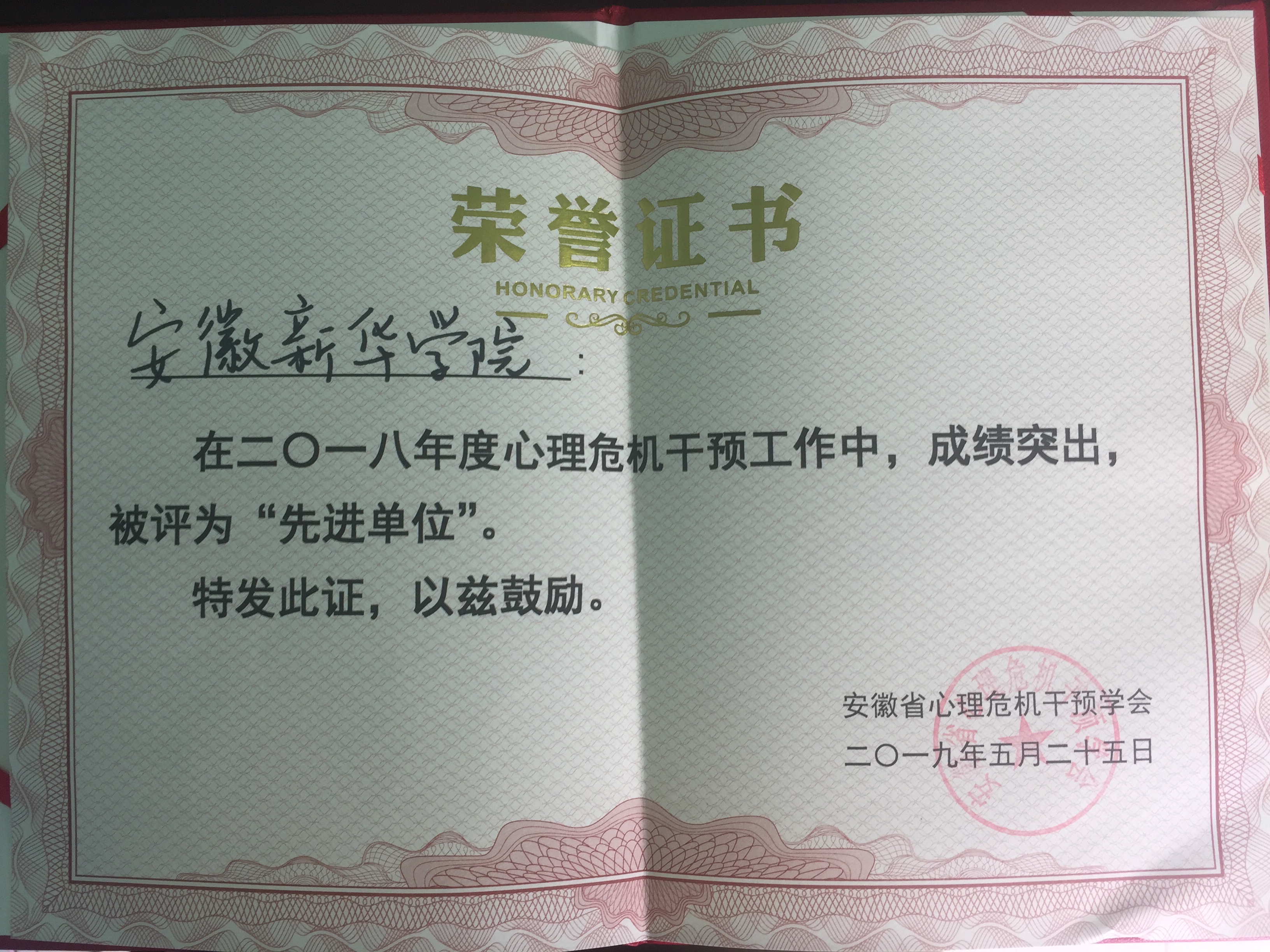 本网讯(通讯员:李梦、凌晨)为加强社会心理服务体系建设,全面开展心理健康教育,重视心理危机干预和心理援助工作,培育心理健康意识,努力形成自尊、自信、理性平和、积极向上的社会心态,5月25日-26日,安徽省心理危机干预2019年学术年会暨心理咨询技能培训在合肥召开,WilliamHill官网选派3名专兼职心理老师参加会议。在本次年会中,WilliamHill官网荣获2018年心理危机干预工作“先进单位”荣誉称号,WilliamHill官网学生处心理健康教育中心老师凌晨获得2018年心理危机干预“先进个人”称号。