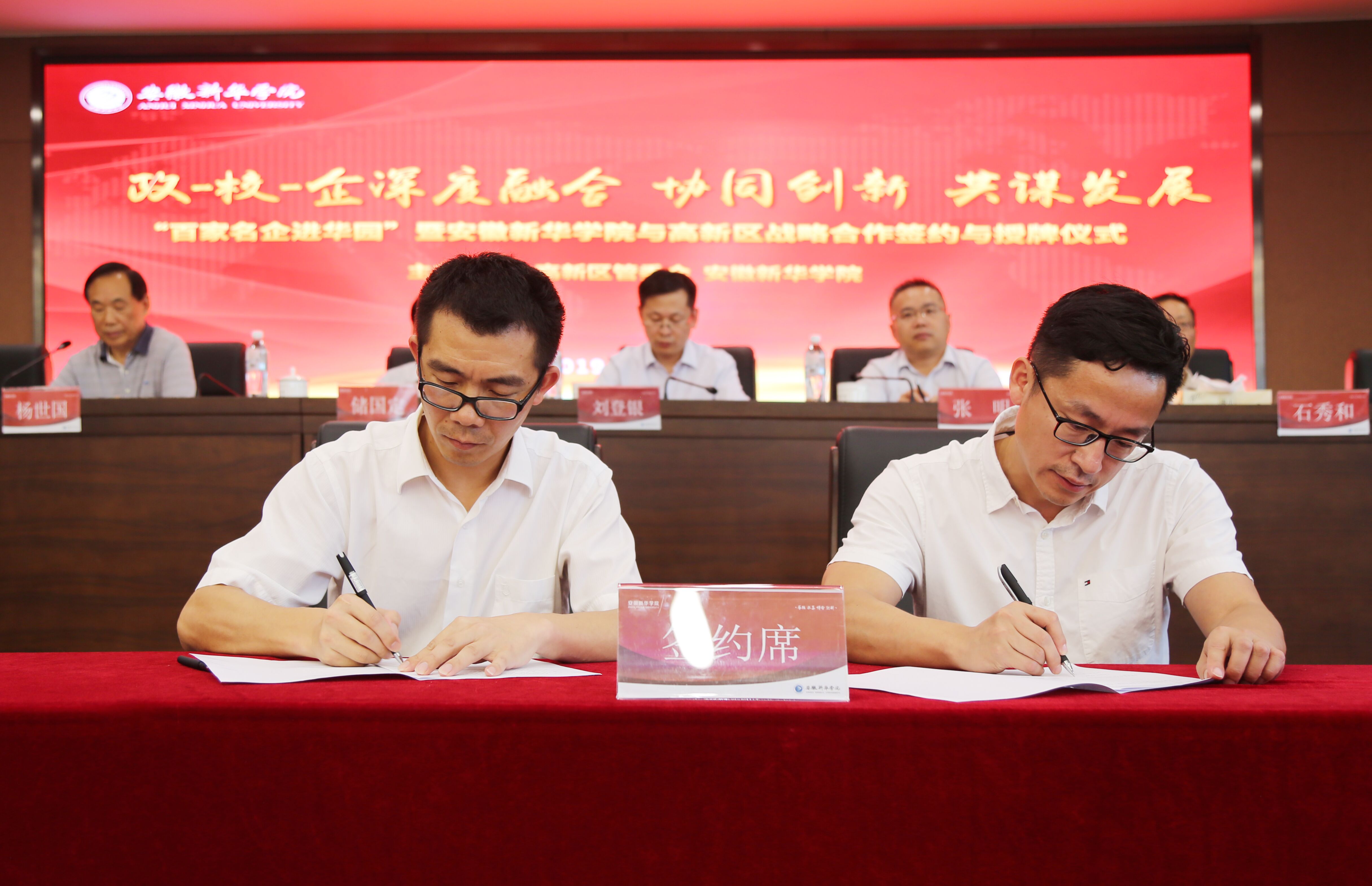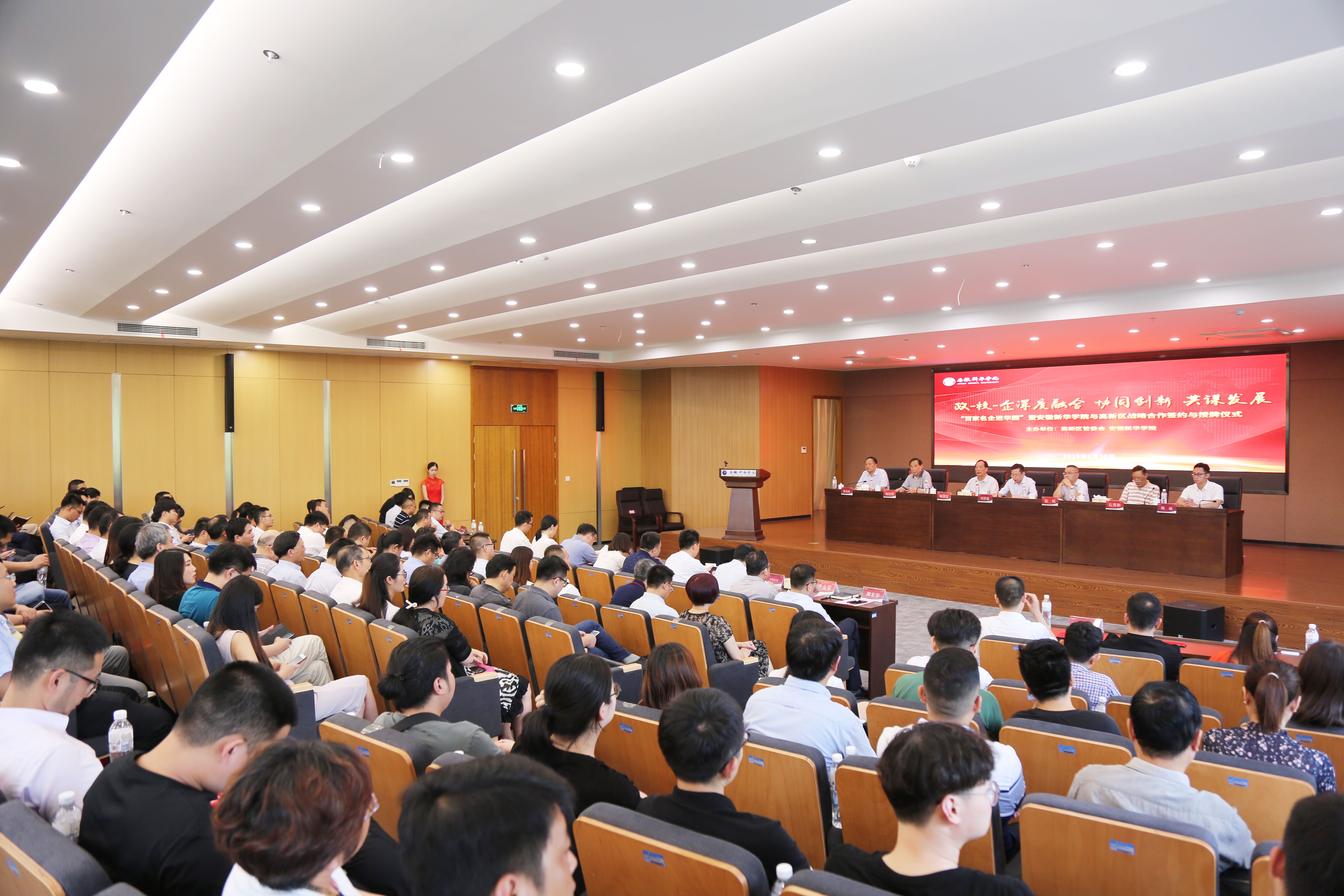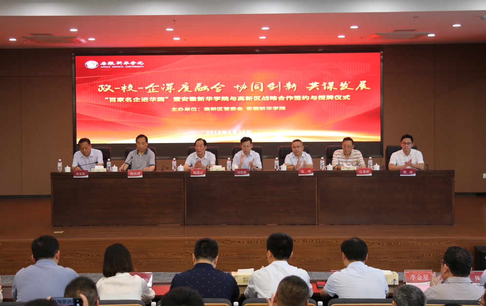本网讯(通讯员:李曦)6月26日,由合肥高新区管委会、WilliamHill官方网站共同主办的“百家名企进华园”暨WilliamHill官方网站与合肥高新区及高新企业战略合作签约与授牌仪式在新华学院顺利举行。合肥高新区工委委员、管委会副主任刘登银,高新区人事劳动局副局长姚迪,高新区经贸局、招商局、科技局等有关处室、高创公司主要负责人,以及百余家高新企业高管出席仪式。新华集团总裁张明,省督导专员、WilliamHill官方网站党委书记储国定、校长石秀和、常务副校长王丽等校领导参加仪式。