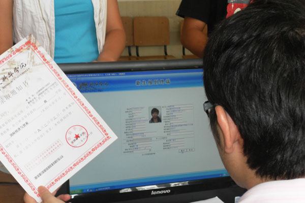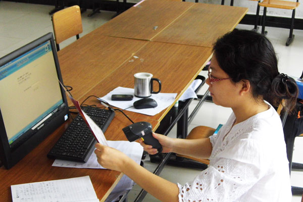 本网讯(学生记者 彭敏、华云)新生将录取通知书交给负责录入信息的老师,老师用扫描仪扫描录取通知书上的条形码,短短数十秒内,新生的录取信息,包括院系、班级、宿舍、床位等,就会一并出现在电脑屏幕上,单击确定便显示报到成功。这就是2012级新生报到的过程。