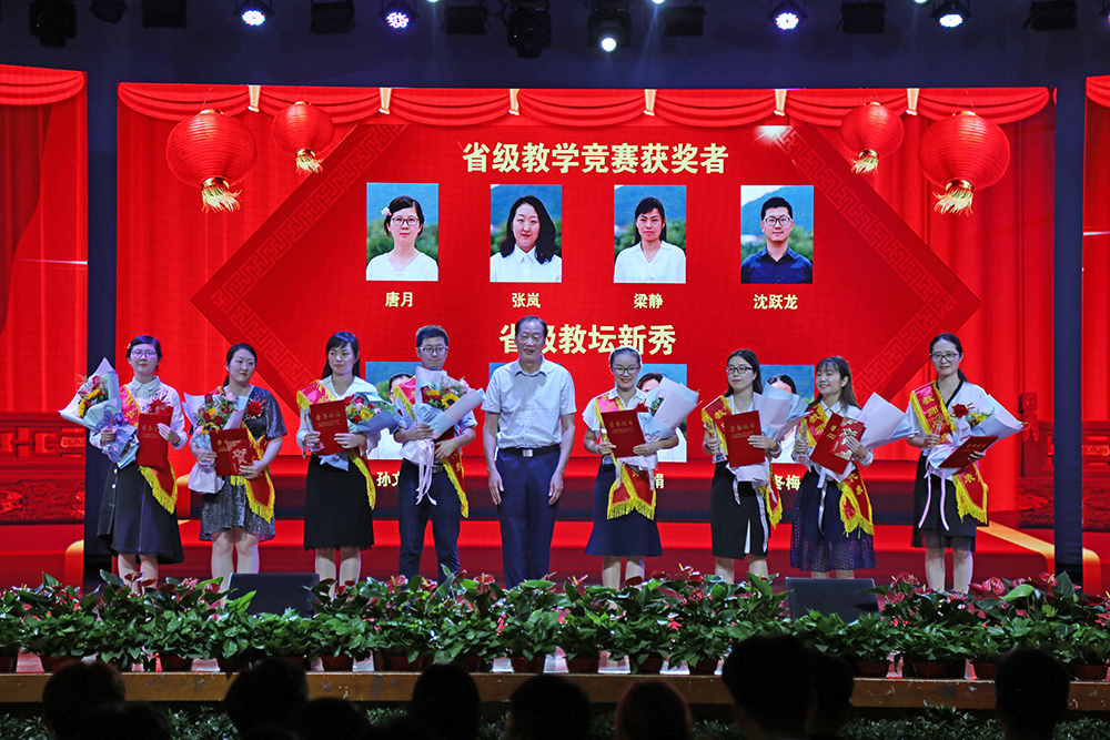 表彰环节分为“一片丹心育桃李”“一枝一叶总关情”“满腔真爱铸师魂”“如椽巨笔绘春秋”四个篇章。第一篇章表彰了“艺体类国赛”“学科与科技竞赛(国家A类)”优秀指导教师。校长助理贺行佳、姜昌植分别为获奖教师颁奖。学生代表手持鲜花,为获奖老师送上节日的祝福。